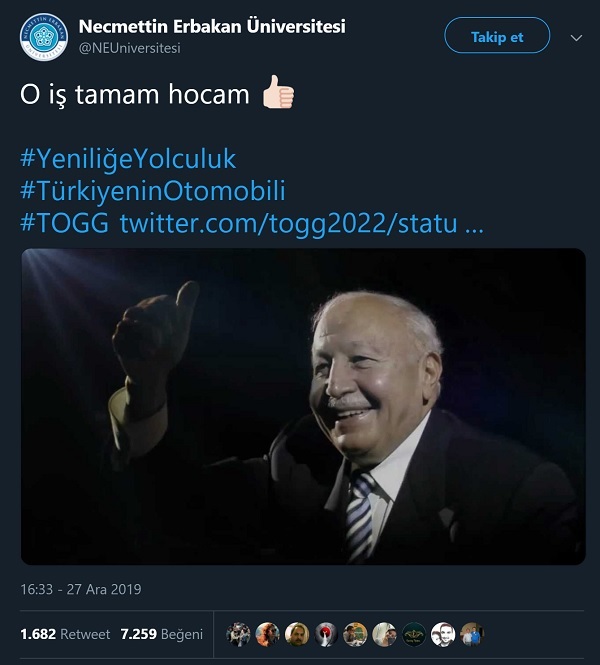 Necmettin Erbakan Üniversitesi’nin Devrim Arabalarını Erbakan’ın ürettiğini ima ettiği “O iş tamam hocam” mesajlı tweeti