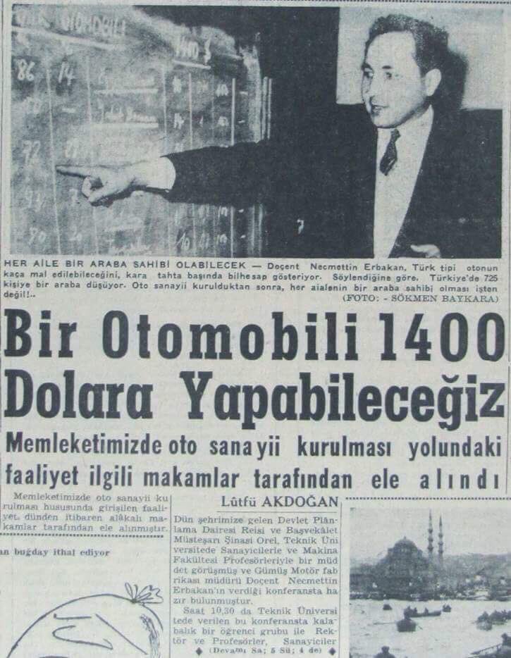 “Doçent Necmettin Erbakan, Türk tipi otonun kaça mal edilebileceğini, kara tahta başında bilhesap gösteriyor. Söylendiğine göre, Türkiye’de 725 kişiye bir araba düşüyor. Oto sanayii kurulduktan sonra, her ailenin bir araba sahibi olması işten değil!”