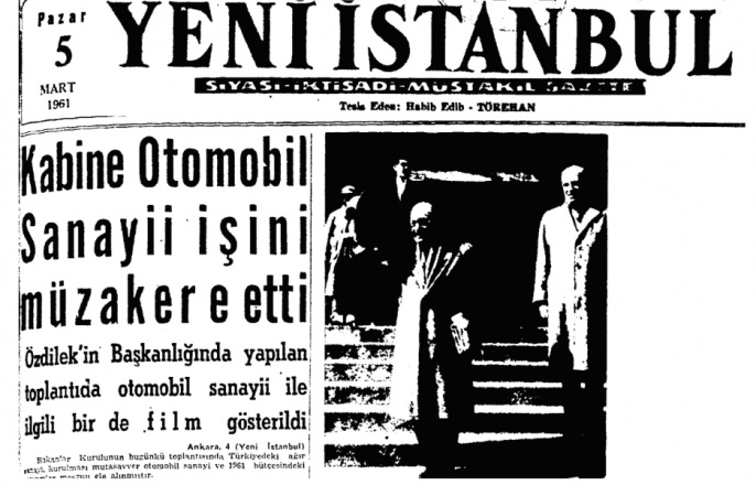 Yeni İstanbul Gazetesinin “Kabine Otomobil Sanayii İşini Müzakere Etti” manşetli 5 Mart 1961 tarihli kapağı