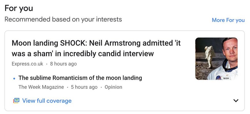 Google’un kullanıcılarına sunduğu tavsiye haberler arasında Neil Armstrong’un Ay’a hiç gitmediklerini itiraf ettiğine yönelik yukarıda bahsi geçen tık tuzağı habere rastlanıyor.