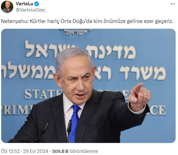 Lübnan Hizbullahına ve işgali altındaki Filistin’e yönelik saldırıları sürerken İsrail Başbakanı Binyamin Netanyahu’nun “Orta Doğuda Kürtler hariç herkesi ezeriz” sözünü sarf ettiği iddiası 29 Eylül 2024 günü sosyal medyada dolaşıma girdi.