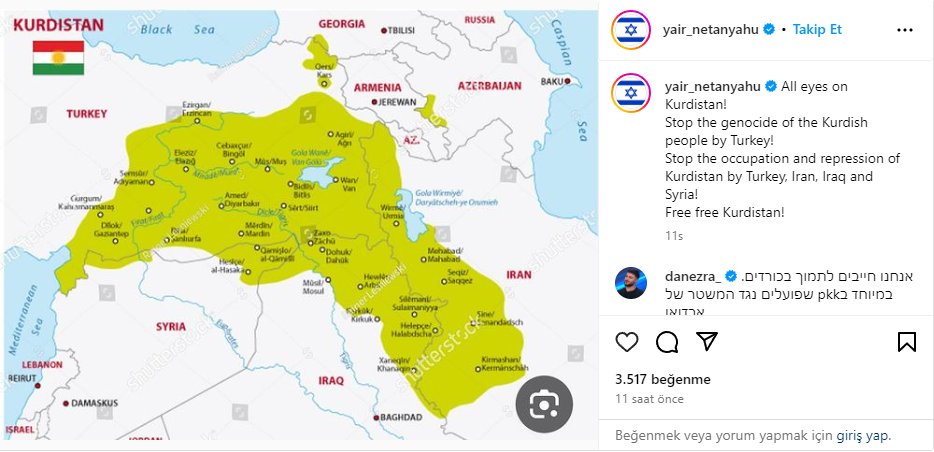 Binyamin Netahyahu’nun oğlu Yair Netanyahu da 30 Mayıs 2024 günü Instagram hesabında Türkiye topraklarını da içine alan sözde ‘Kürdistan’ haritası paylaşıp Türkiye’yi Kürtlere soykırım yapmakla suçladı.