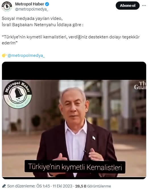 Metropol Haber (@metropolmedya_): “Sosyal medyada yayılan video, İsrail Başbakanı Netenyahu İddiaya göre : “Türkiye’nin kıymetli kemalistleri, verdiğiniz destekten dolayı teşekkür ederim””