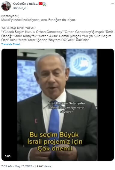 Uydurulan alt yazının eklendiği videoyu Netenyahu’nun 14 Mayıs seçimlerinde Cumhurbaşkanı Erdoğan’ı kastederek “Mursi’yi nasıl indirdiysek, sıra onda” ifadelerini kullandığı iddiasıyla aktaran paylaşım örneği şöyle sunulabilir: