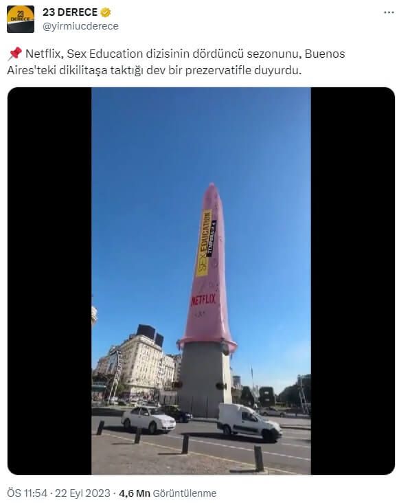 23 Derece (@yirmiucderece): ” Netflix, Sex Education dizisinin dördüncü sezonunu, Buenos Aires’teki dikilitaşa taktığı dev bir prezervatifle duyurdu.”