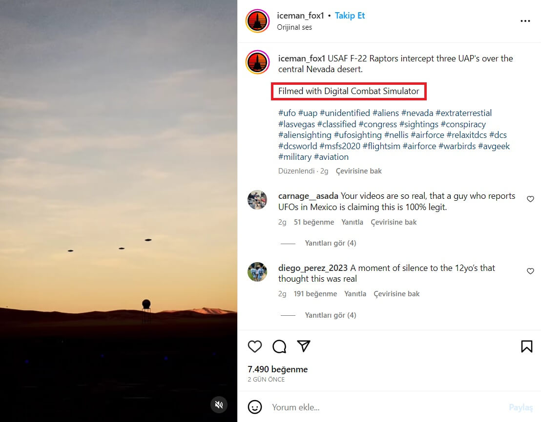 Nevada çölü üzerinde uçan üç uzay aracının ABD Hava Kuvvetlerine ait uçaklar tarafından yakalandığı anda kaydedildiği iddiasıyla paylaşılan video “Dijital Savaş Simülatörü” (“Digital Combat Simulator” – DCS) olarak adlandırılan gerçekçi hava savaşı simülasyonundan.