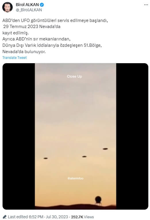 Birol ALKAN (@_BirolALKAN): “ABD’den UFO görüntülüleri servis edilmeye başlandı, 29 Temmuz 2023 Nevada’da kayıt edilmiş. Ayrıca ABD’nin sır mekanlarından, Dünya Dışı Varlık iddialarıyla özdeşleşen 51.Bölge, Nevada’da bulunuyor.”
