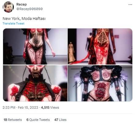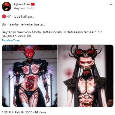 6 – 10 Şubat 2023 tarihleri arasında gerçekleşen New York Moda Haftası etkinlikleri kapsamında düzenlenen bir defilede şeytan, kan ve et temalı sıra dışı kıyafetlerin modeller tarafından giyildiği iddiasıyla aşağıdaki görseller paylaşılmış.