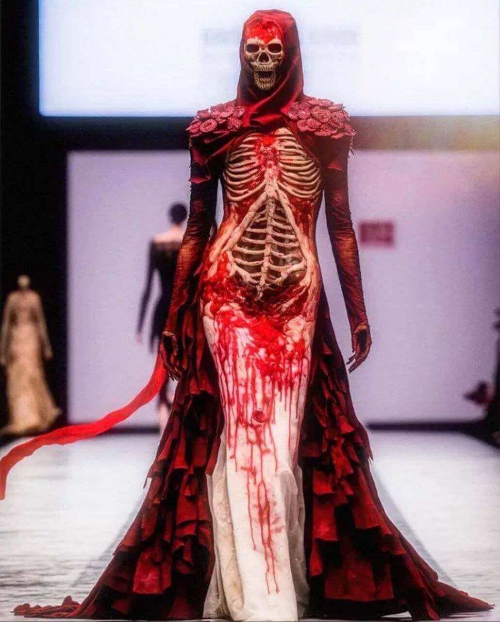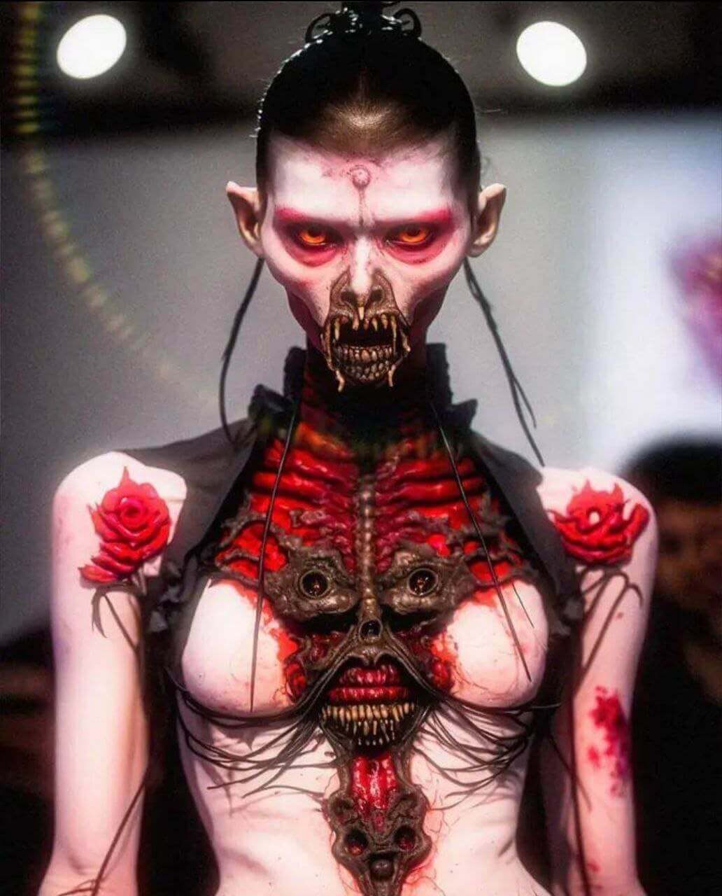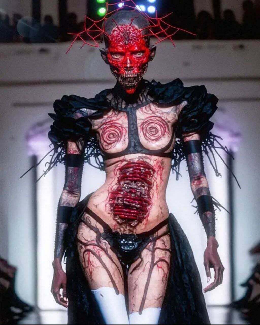 New York Moda Haftası etkinlikleri kapsamında düzenlenen bir defilede şeytan, kan ve et temalı sıra dışı kıyafetlerin modeller tarafından giyildiği iddiasıyla paylaşılan görseller yapay zeka uygulaması ile hazırlanmış.