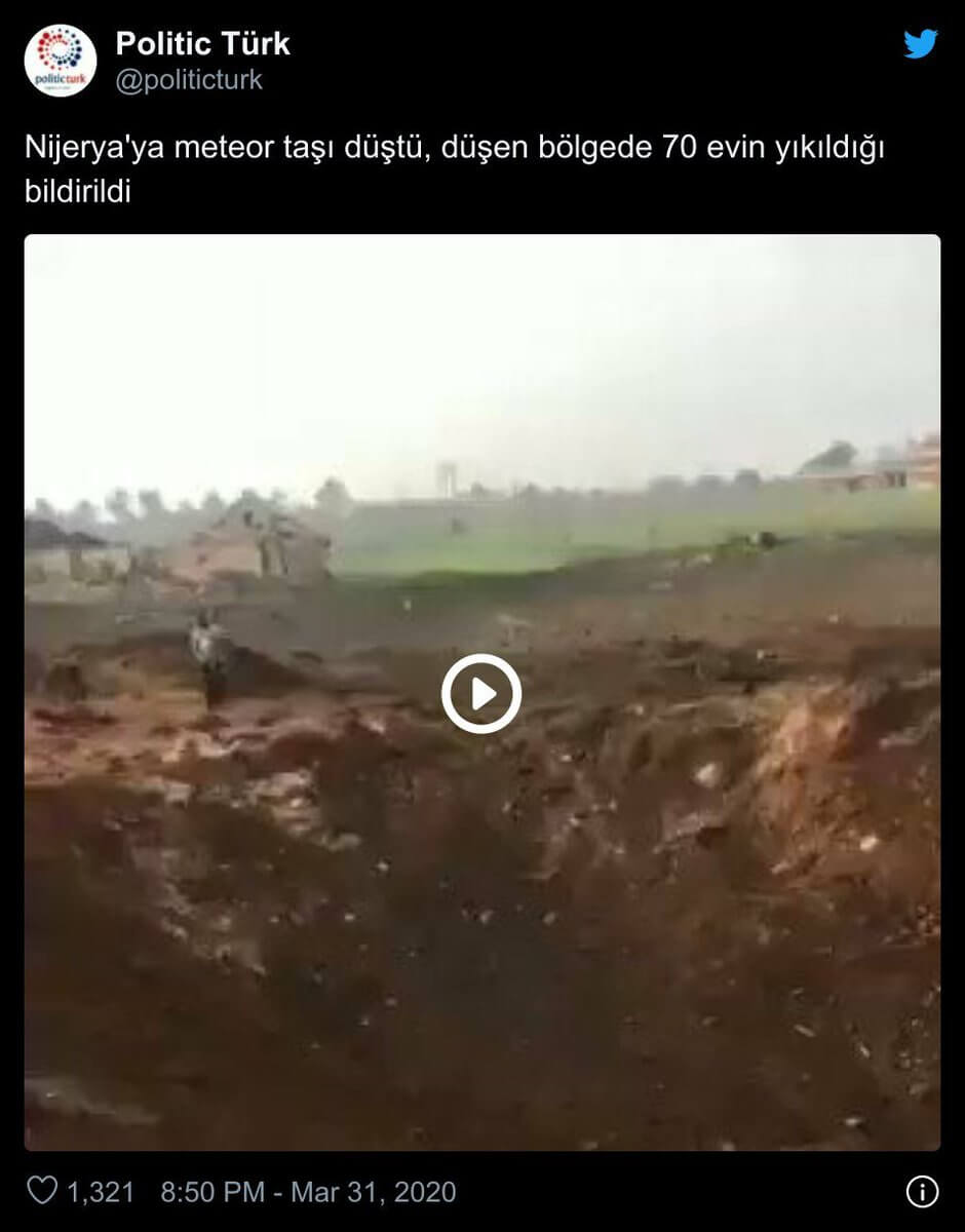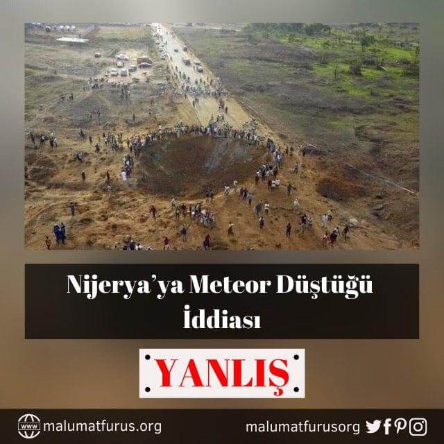 1 Nisan 2020 tarihinde Nijerya’ya dev bir meteor düşmedi. Nijerya’da oluşan devasa çukurun sebebinin meteor düşmesi olduğu iddiası doğru değil. Görünen dev çukur Nijerya’da 3 gün önce taş ocağı şirketine ait patlayıcıları taşıyan kamyonun belirlenemeyen bir sebepten ötürü infilak etmesi sonucu oluşmuş.