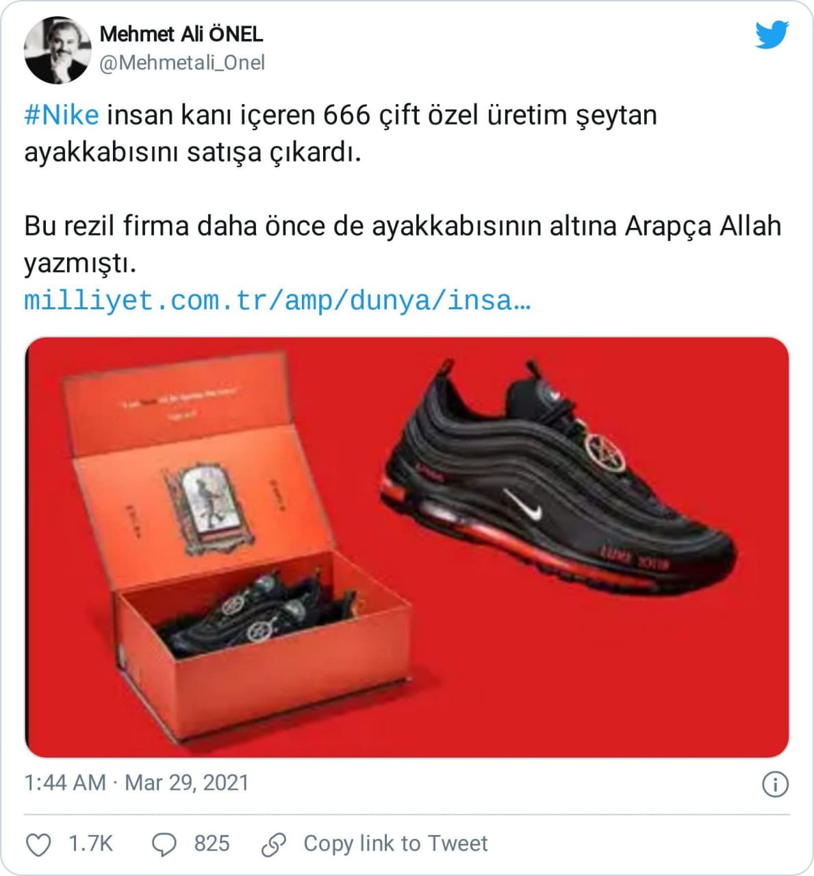 “Nike, seytan ayakkabısı ile ilgisi olmadığını açıklamış. Logosu markası açıkça kullanılan firma, günler sonra ancak açıklama yapabildi. Firma yeterince reklamının yapıldığına kanaat getirmiş olmalı. Bu ucuz numaraları kimse yemiyor artık!”