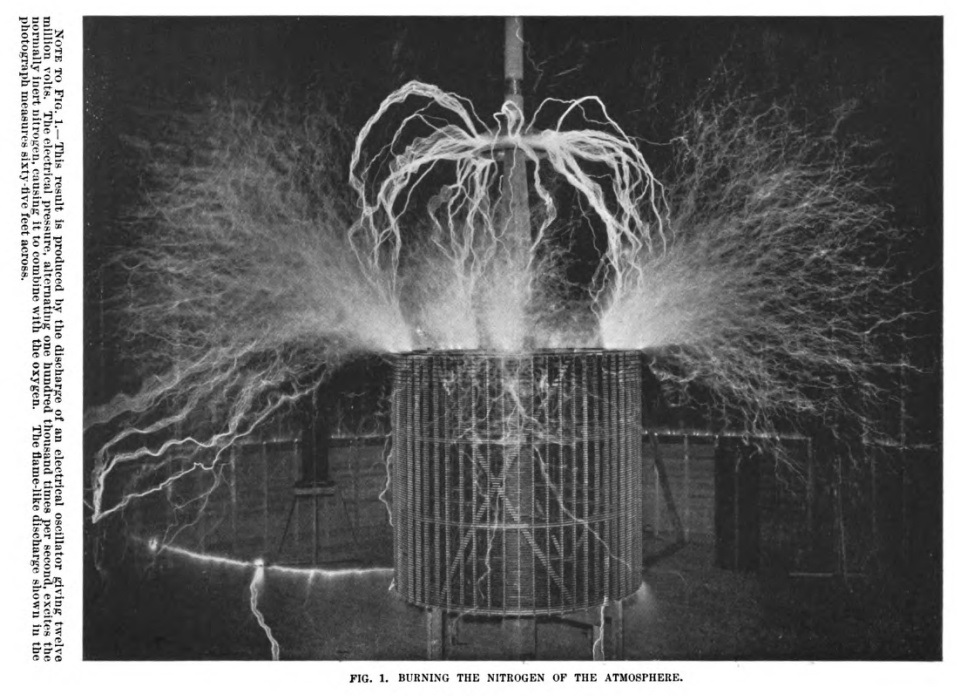 “The wizard at his Colorado Springs laboratory sitting among sixty-foot electrical sparks in this illustrious multiple-exposure photograph.”