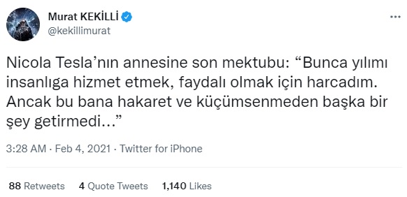 “Bunca yılımı insanlığa hizmet etmek faydalı olmak için harcadım. Ancak bu bana hakaret ve küçümsenmeden başka bir şey getirmedi.” sitemini içeren metin Nikola Tesla’nın annesine yazdığı bir mektuba ait değil