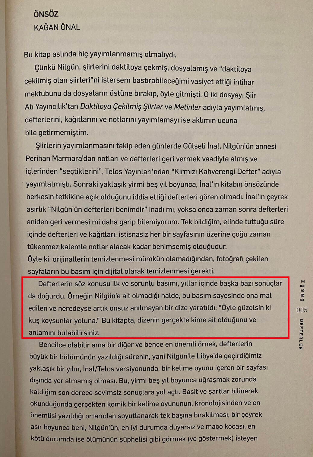 ” O evde hiçbir şair şiirler yazan bir Nilgün Marmara’yı konuşmadı hiçbir zaman. Yediler, içtiler, güldüler, eğlendiler, dedikodu yaptılar ve sonra çıkıp inlerine döndüler. Ama Nilgün Marmara’nın şiirlerinden bihaber olmanın cezasını hep Kağan Önal’a kestiler. Kağan ne yayıncıydı, ne şair ne de yazan biri. Kağan Önal’ın o şiirleri okuması, beğenmesi hiçbir anlamaya gelmeyecekti zaten Nilgün Marmara için. O yazanların edebiyat beğenisiyle ilgileniyordu, yazmayan birinin değil.”