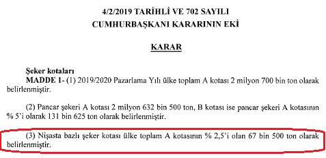 5 Şubat 2019 tarihli Resmi Gazete’de yayımlanan 2019/2020 Pazarlama Yılı Şeker Kotalarının Belirlenmesine İlişkin Karar (Karar Sayısı: 702) ile nişasta bazlı şeker kotası ülke toplam A kotasının yüzde 2,5’i olan 67 bin 500 ton olarak belirlenmişti.