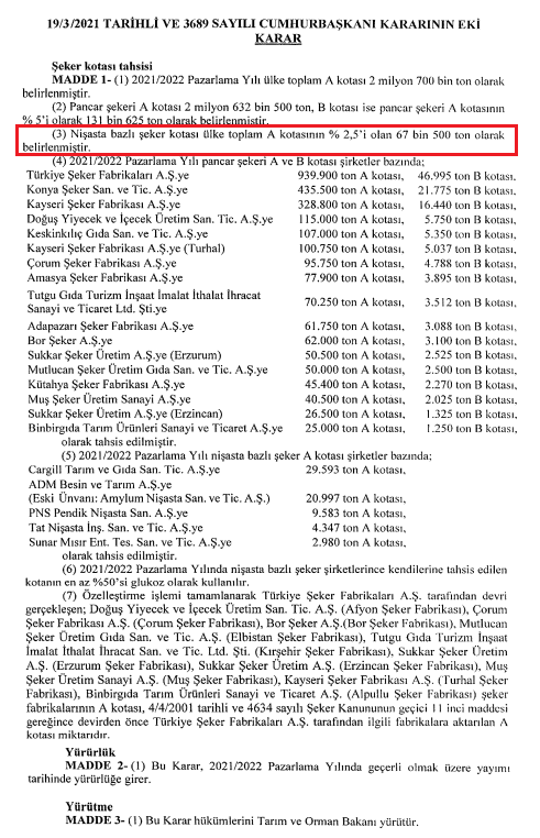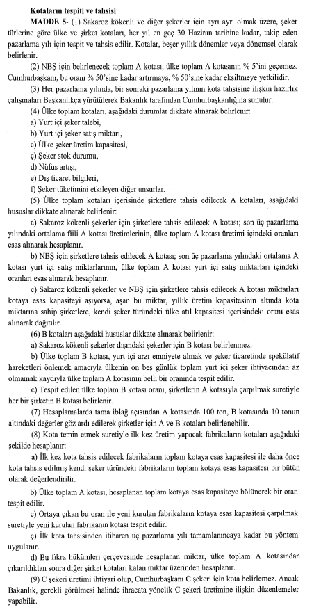Madde 3 – Şeker üretimi ve arzında istikrarı sağlamak amacıyla pazarlanacak şeker miktarı, sakaroz kökenli ve diğer şekerler için ayrı ayrı olmak üzere şeker türlerine göre, gerektiğinde dönemsel olarak kotalar ile belirlenir. Nişasta kökenli şekerler için belirlenecek toplam A kotası, ülke toplam A kotasının % 5’ini geçemez. Cumhurbaşkanı bu oranı,% 50’sine kadar artırmaya, % 50’sine kadar eksiltmeye yetkilidir.