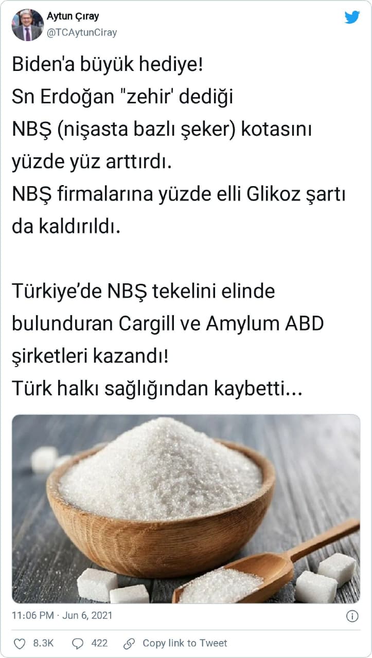 “Biden’a büyük hediye! Sn Erdoğan “zehir’ dediği NBŞ (nişasta bazlı şeker) kotasını yüzde yüz arttırdı. NBŞ firmalarına yüzde elli Glikoz şartı da kaldırıldı. Türkiye’de NBŞ tekelini elinde bulunduran Cargill ve Amylum ABD şirketleri kazandı! Türk halkı sağlığından kaybetti…”
