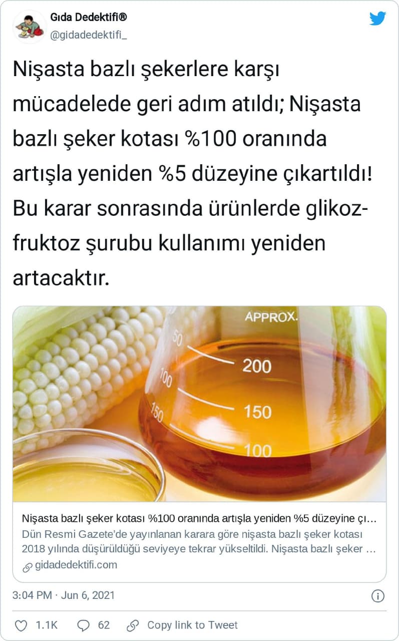 “Nişasta bazlı şekerlere karşı mücadelede geri adım atıldı; Nişasta bazlı şeker kotası %100 oranında artışla yeniden %5 düzeyine çıkartıldı! Bu karar sonrasında ürünlerde glikoz-fruktoz şurubu kullanımı yeniden artacaktır.”