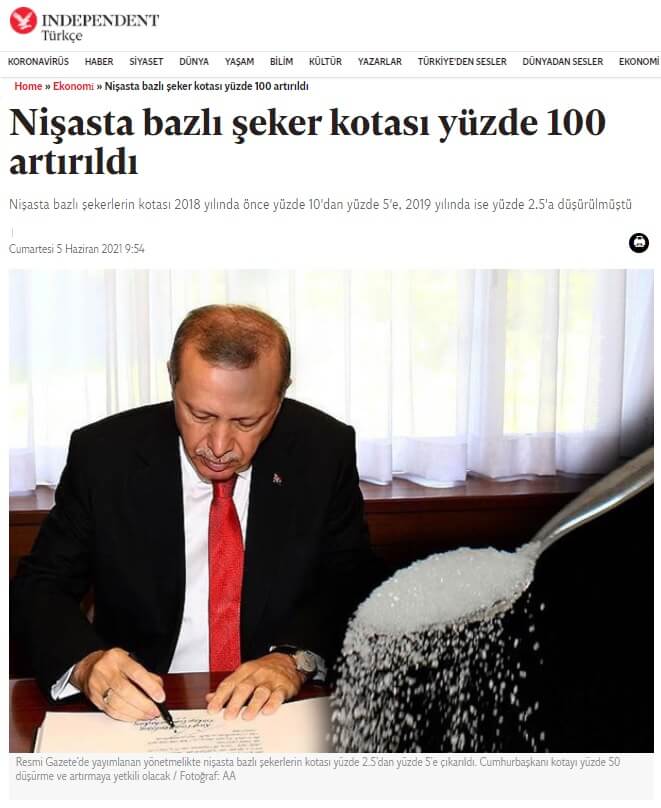 Cumhurbaşkanı bu kotayı yüzde 50 düşürme ve artırmaya yetkili olacak. Bilindiği üzere nişasta bazlı şekerlerin kotası 2018 yılında önce yüzde 10’dan yüzde 5’e bir yıl sonra da yüzde 2,5’a düşürülmüştü. 2002’deki yönetmelik yürürlükten kaldırıldı Diğer yandan 2002 yılında uygulamaya konulan, şeker kotalarının düzenlenmesine ilişkin yönetmelikte yürürlükten kaldırıldı.