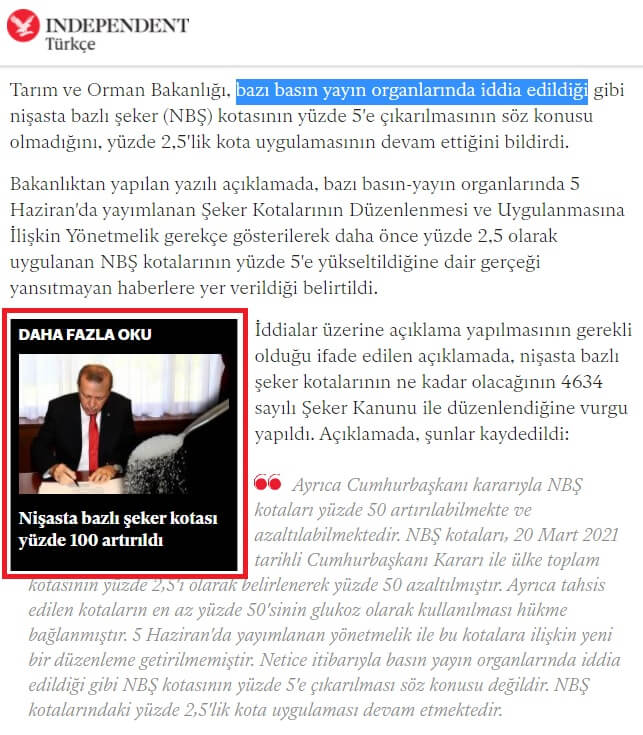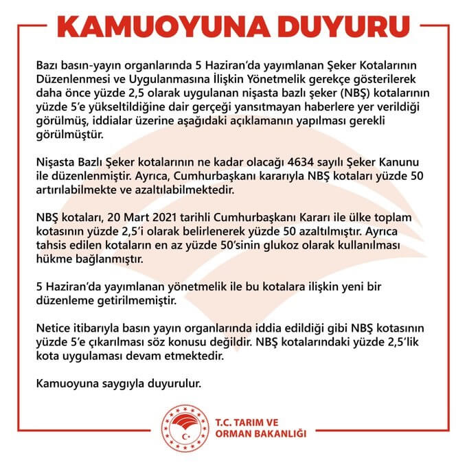 Bazı basın-yayın organlarında 5 Haziran’da yayımlanan Şeker Kotalarının Düzenlenmesi ve Uygulanmasına İlişkin Yönetmelik gerekçe gösterilerek daha önce yüzde 2,5 olarak uygulanan nişasta bazlı şeker (NBŞ) kotalarının yüzde 5’e yükseltildiğine dair gerçeği yansıtmayan haberlere yer verildiği görülmüş, iddialar üzerine aşağıdaki açıklamanın yapılması gerekli görülmüştür.