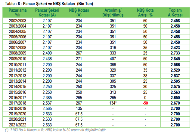 Toplam A kotası 2 milyon 700 bin ton olarak belirlenmiş Nişasta Bazlı Şekerler payı için %2,5 üzerinden 67,5 milyon ton olarak belirlenmişti. Pancar şekeri A kotası 2.6 milyon ton, B kotası ise pancar şekeri A kotasının %5’i olarak 131,625 ton olarak tespit edilmişti.