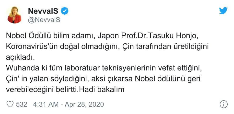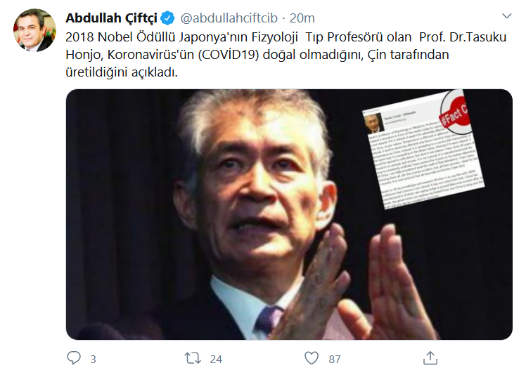 Abdullah Çiftçi ise “2018 Nobel Ödüllü Japonya’nın Fizyoloji Tıp Profesörü olan Prof. Dr. Tasuku Honjo, Koronavirüs’ün (COVID-19) doğal olmadığını, Çin tarafından üretildiğini açıkladı” ifadelerini kullanmıştı.