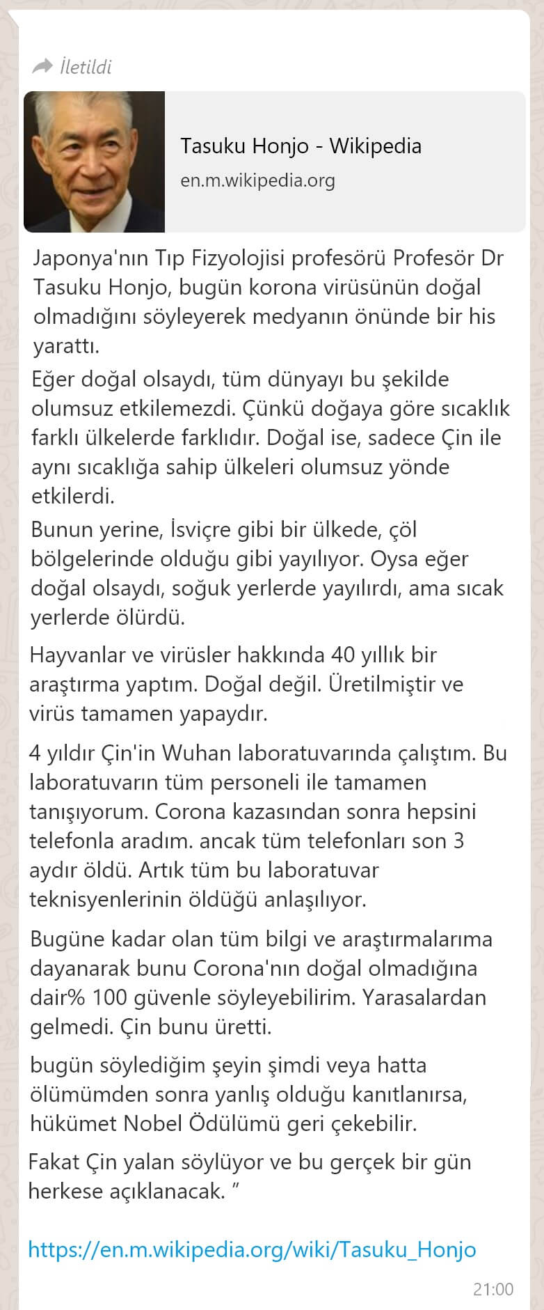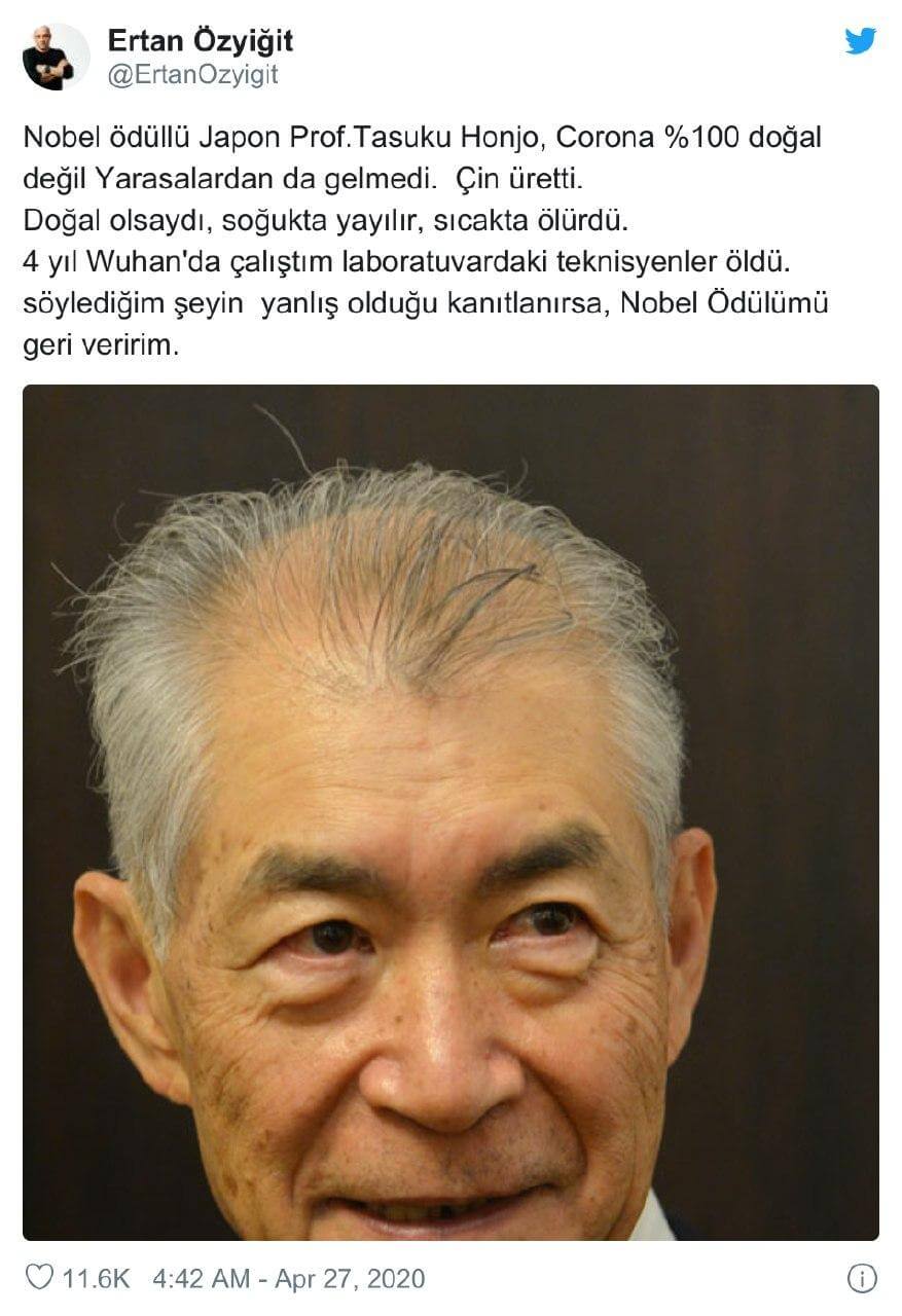 “Nobel ödüllü Japon Prof.Tasuku Honjo, Corona %100 doğal değil Yarasalardan da gelmedi. Çin üretti. Doğal olsaydı, soğukta yayılır, sıcakta ölürdü. 4 yıl Wuhan’da çalıştım laboratuvardaki teknisyenler öldü. söylediğim şeyin yanlış olduğu kanıtlanırsa, Nobel Ödülümü geri veririm.”