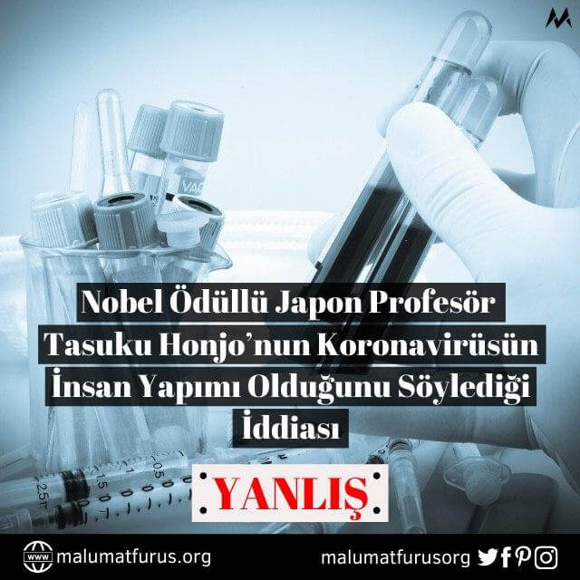 Nobel ödüllü Japon bilim insanı Tasuku Honjo, Wuhan Viroloji Enstitüsü’nde çalışmadı, koronavirüsün “icat edildiğini” ya da “insan yapımı” olduğunu söylemedi. Bu asılsız iddianın kökeni Prof. Honjo’yu taklit eden bir Twitter profiline dayanıyor. Nobel Ödülü sahibi Tasuku Honjo, kendi adı kullanılarak uydurulan “virüs insan yapımı” iddialarıyla hiçbir ilgisi olmadığını açıkladı.