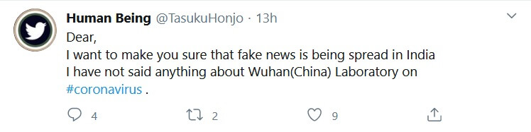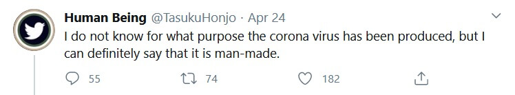 “Koronavirüsün doğal olmadığını yüzde 100 güvenle söyleyebilirim, yarasalardan da gelmedi, Çin bunu üretti.” sözlerinin kaynağı, Tasuku Honjo’yu taklit ettiği aşikâr olan sahte bir hesap tarafından 24 Nisan 2020 tarihinde atılan birkaç tweet.