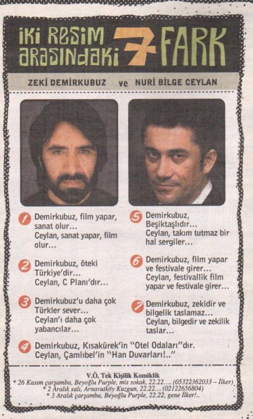 Tarzları birbirinden farklı iki ünlü yönetmen sıklıkla sinemaseverlerce tarafından birbiriyle kıyaslanmakta / karşılaştırılmakta (Örnek için Ekşi Sözlük’teki “zeki demirkubuz vs nuri bilge ceylan” başlığına göz atılabilir).
