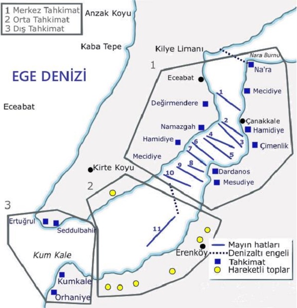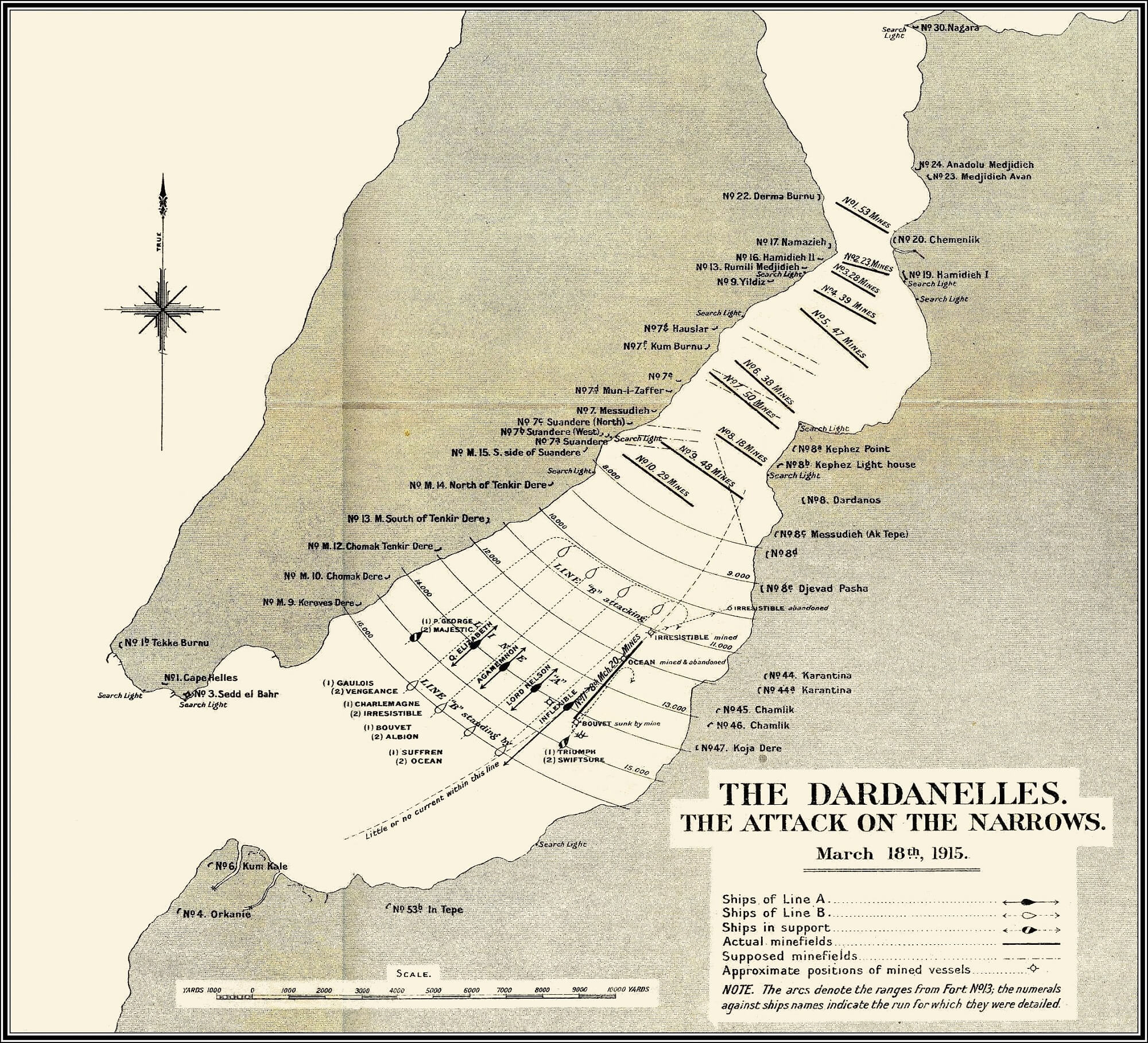 18 Mart 1915 günü 6 savaş gemisinden oluşan 3 filo ile gerçekleştirilen büyük saldırı öncesinde müttefik devletler donanması da bölgede mayın arama faaliyetleri gerçekleştirmişti. 17-18 Mart gecesi üç muhriple yedi arama-tarama gemisi Boğaz girişinden Kepez’e kadar olan kısmın temiz olduğunu bildirmişti. Ancak, Yüzbaşı Hakkı Bey kumandasındaki Nusret, 8 Mart saat 05.00’ten itibaren Erenköy Koyu’na kuzeydoğu-güneybatı yönünde ve Boğaz mihverine paralel olarak 100 metre aralıklarla 26 mayın dökmüştü (Prof. Dr. Zeki Arıkan, Salih Özbaran, Prof. Dr. İdris Bostan, Lütfü Sancar. Türk Denizcilik Tarihi. 2. Cilt. Boyut Yayıncılık. 2009).