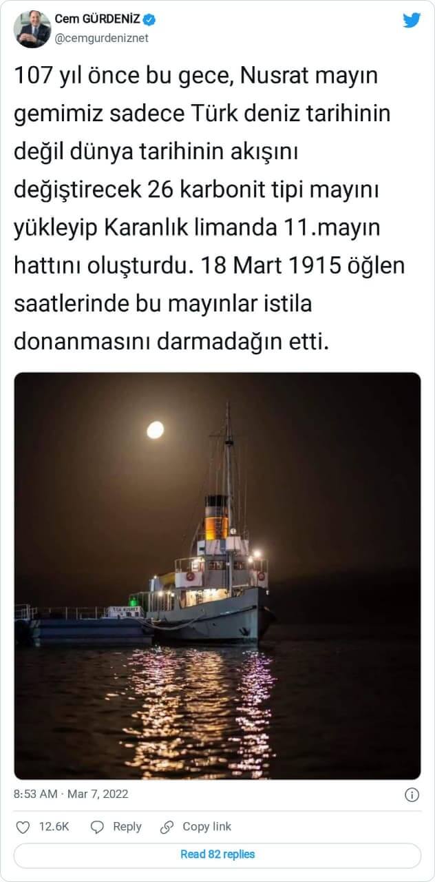 “107 yıl önce bu gece, Nusrat mayın gemimiz sadece Türk deniz tarihinin değil dünya tarihinin akışını değiştirecek 26 karbonit tipi mayını yükleyip Karanlık limanda 11.mayın hattını oluşturdu. 18 Mart 1915 öğlen saatlerinde bu mayınlar istila donanmasını darmadağın etti.”