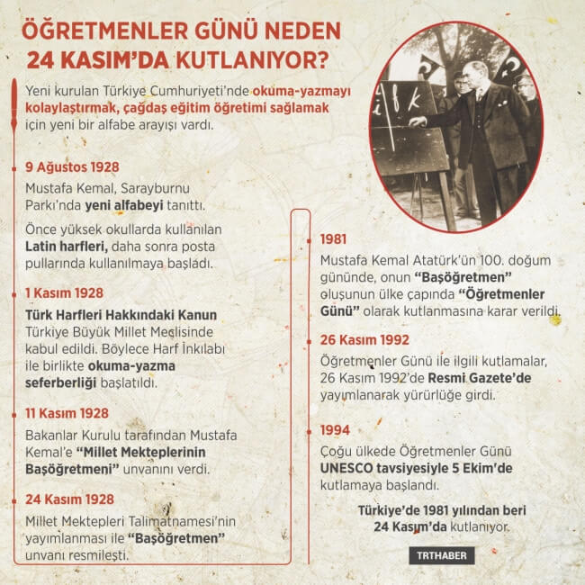“Türkiye’de her yıl 24 Kasım, Öğretmenler Günü olarak kutlanır. Bu, 1981 yılında başlamış bir uygulamadır. 24 Kasım 1928, Türkiye Cumhuriyeti devletinin kurucusu Mustafa Kemal Atatürk’ün “Millet Mektepleri’nin Başöğretmenliği”ni kabul ettiği gündür.”