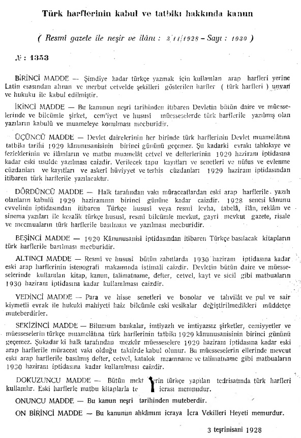 Latin alfabesine dayalı yeni Türk alfabesinin yürürlüğe konmasına dair 1 Kasım 1928 tarihli ve 1353 sayılı Türk Harflerinin Kabul ve Tatbiki Hakkında Kanun TBMM’de oybirliği ile kabul edilmişti.