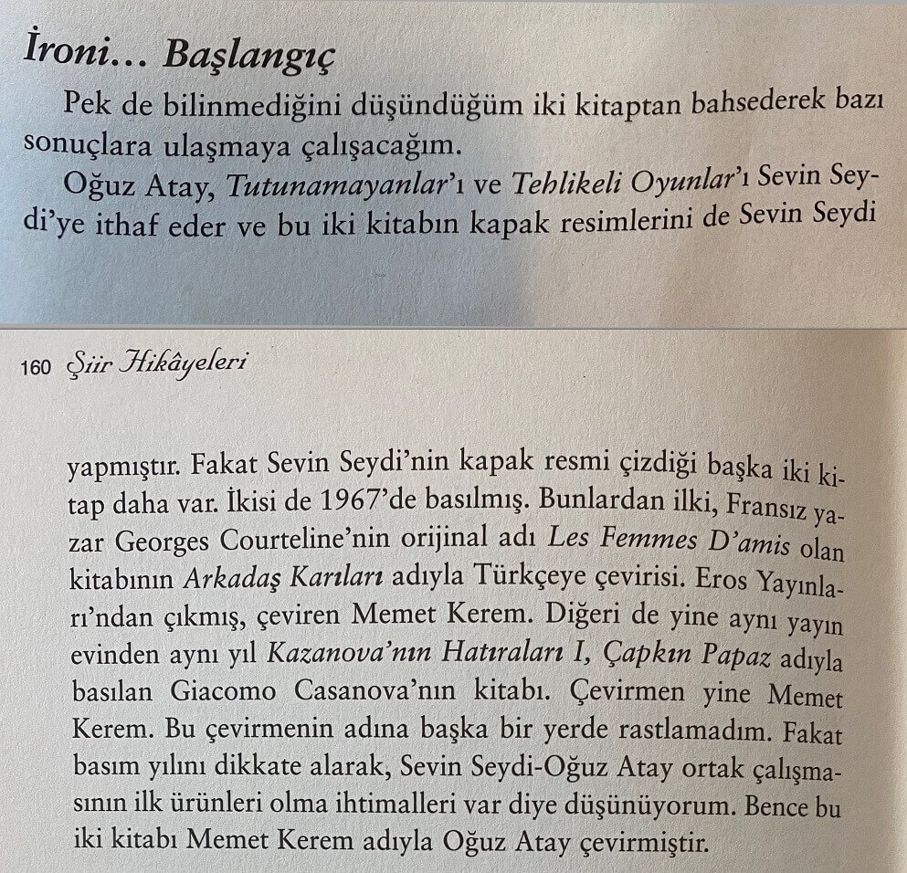 We have just come across a bit of fake news, which has been circulating since 2008, that in 1967 Oğuz Atay translated two books under the pseudonym Mehmet Kerem, published by the aptlynamed Eros Press. This first appeared in a book, Şiir Hikayeleri, by Professor Haluk Oral, whose only ‘evidence’ is that the cover design was by Sevin Seydi. He goes on to make psychological inferences. It is time to nail this. Sevin Seydi writes: