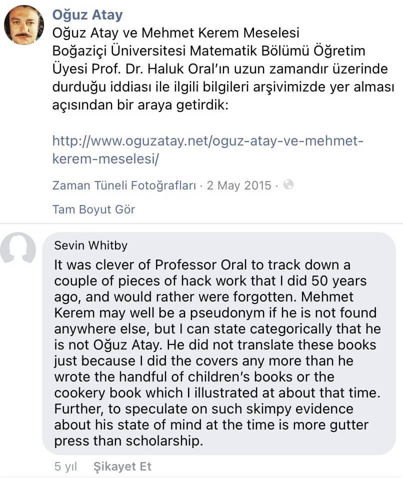 “Profesör Oral’ın 50 yıl önce yaptığım ve unutulmuş olmasını umduğum bazı karalamaların izini sürmesi akıllıcaydı. Mehmet Kerem ismi, böyle biri yoksa gerçekten müstear olabilir, ama Oğuz Atay olmadığını kesin olarak söyleyebilirim. Ne bu kitabı ne de o dönemde kapaklarını hazırladığım çocuk ve yemek tarifi kitaplarını Oğuz Atay çevirdi. Kapağını benim hazırlamış olmam gibi son derece yetersiz bir kanıta dayanarak akıl yürütmesi, Oral’ın bir akademisyen değil de bir magazin habercisi gibi düşündüğünü gösteriyor.”