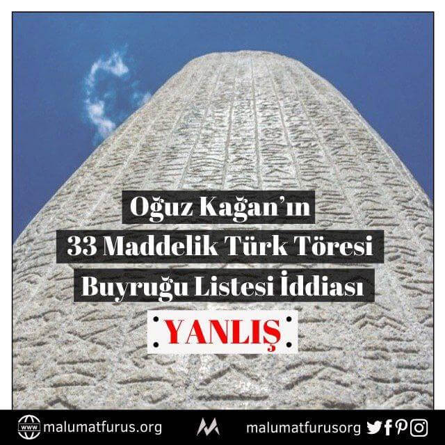“Türk’ün Kadim Töresi”ne ait olduğu ve Oğuz Kağan tarafından buyrulduğu iddiasıyla paylaşılan 33 maddelik “töre / kanun” listesi, Orhun Kitabelerinde ve benzer metinlerde yer alan Türk töresini aktaran metinlerden istifade edilerek uydurulmuş metinlerdir.