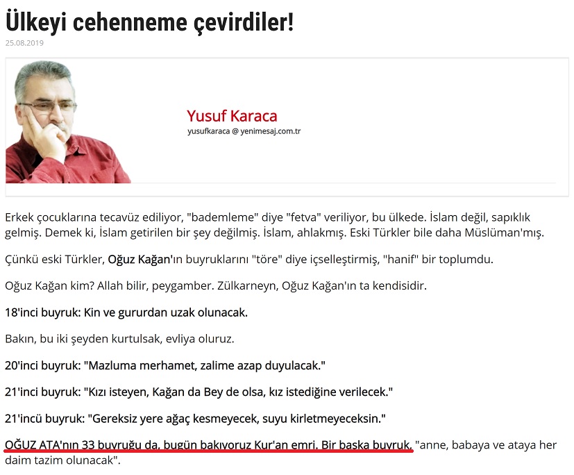 Yeni Mesaj’daki “Ülkeyi cehenneme çevirdiler!” başlıklı 25 Ağustos 2019 tarihli yazısıyla Yusuf Karaca: