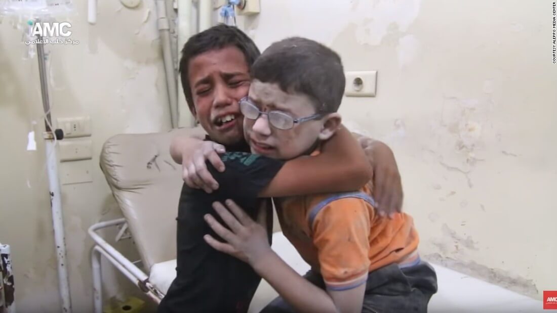 Paylaşılan görüntülerde saldırının ardından kardeşlerinin öldüğünü öğrenen iki çocuğun birbirlerine sarılarak hüngür hüngür ağladıkları görülüyor.