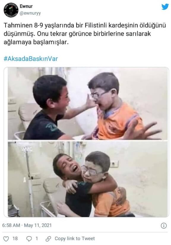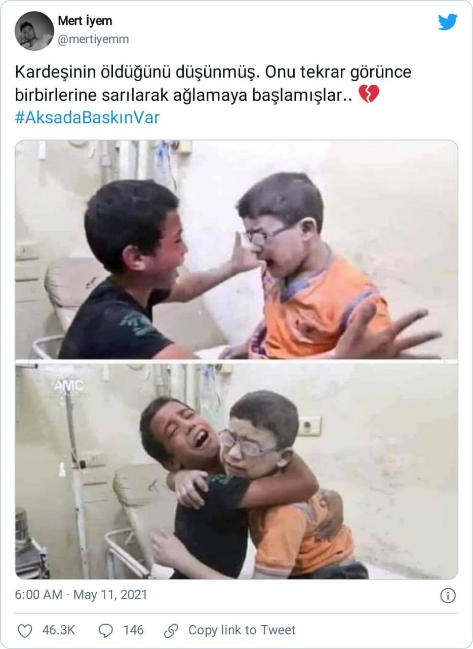 “Tahminen 8-9 yaşlarında bir Filistinli kardeşinin öldüğünü düşünmüş. Onu tekrar görünce birbirlerine sarılarak ağlamaya başlamışlar. #AksadaBaskınVar”