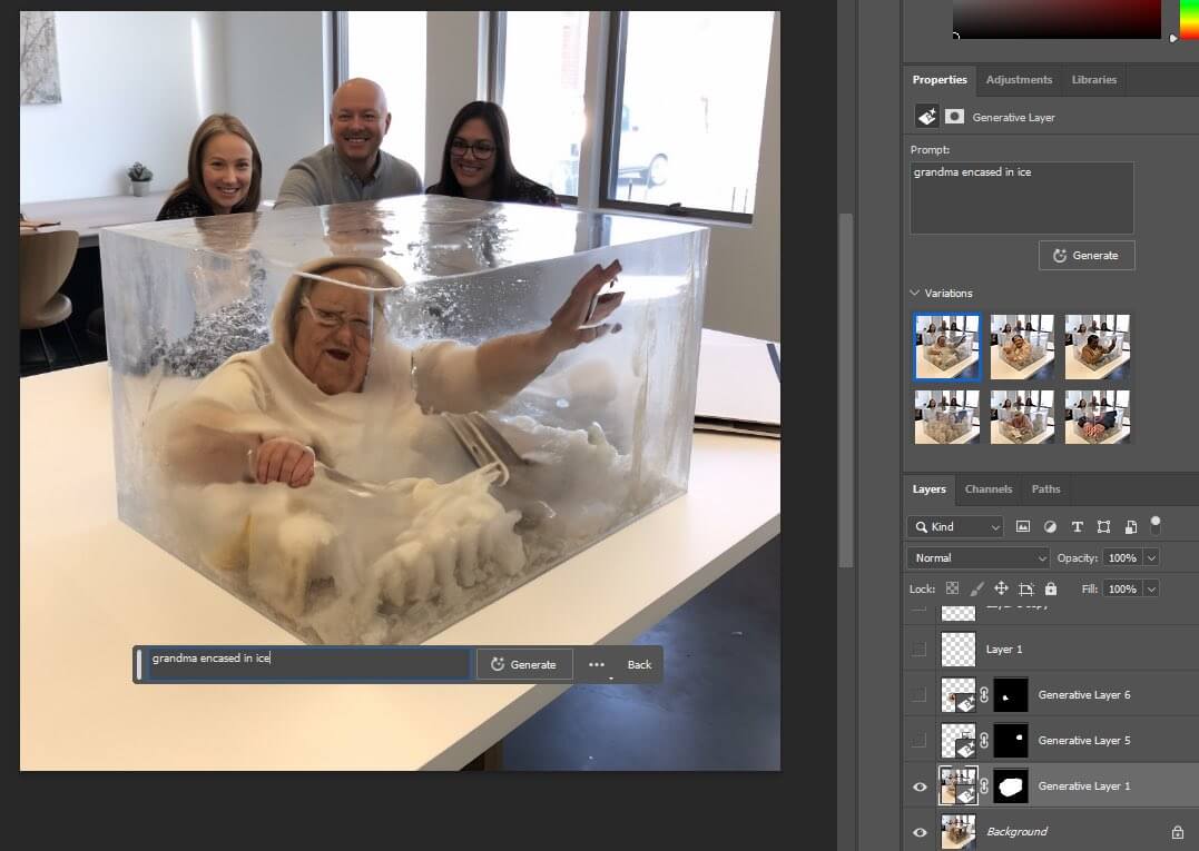 Bahsi geçen sosyal medya kullanıcısı, Kelly Port adlı görsel efekt uzmanının Babalar Günü vesilesiyle mizahî üslupla “Sevdiklerinizi akrilik reçine ile kaplayın, harika bir Babalar Günü hediyesi!” notuyla paylaştığı görseli Adobe Photoshop’un yapay zekâ destekli “üretken dolgu” özelliğiyle hazırlamış. Köpeğin yerine babaanne fotoğrafını yapay zekâ desteğiyle görsele eklemiş.