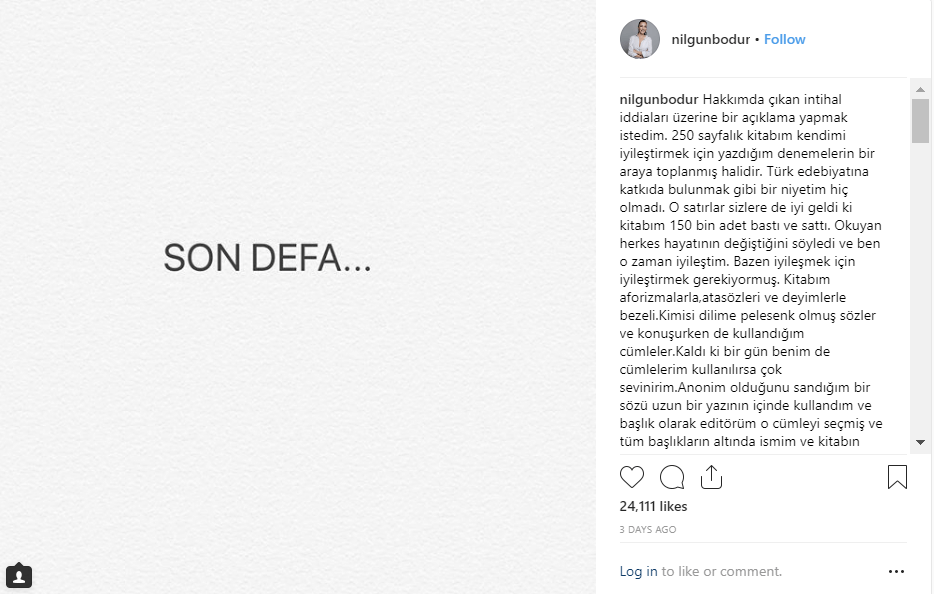 Sosyal medya hesabından intihal iddiaları hakkında yaptığı açıklamada Nilgün Bodur, bahsi geçen sözün anonim olduğunu sandığını şu sözlerle belirtmiş: