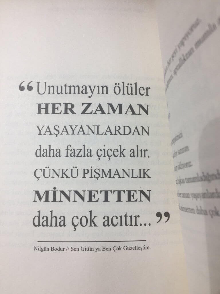 Nilgün Bodur, “Sen Gittin Ya Ben Çok Güzelleştim” (2008. İstanbul. Destek Yayınları) adlı kitabında “Unutmayın ölüler yaşayanlardan daha çok çiçek alır. Çünkü pişmanlık minnetten daha çok acıtır.” sözüne yer vermiş.