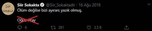 Yanlış imzalı söz veya şiirleri incelerken mütemadiyen karşımıza çıkan Twitter hesaplardan “Şiir Sokakta” bu hataya da ortak olarak yine şaşırtmıyor: