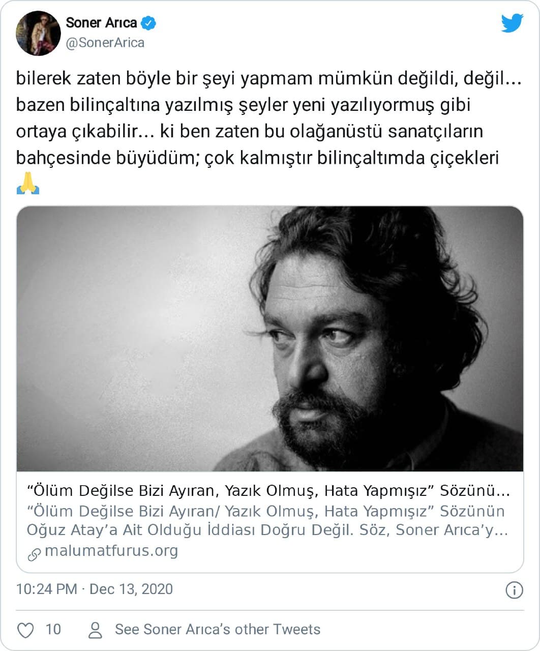 Kendisine ait şarkı sözünün Oğuz Atay’a ait sanılmasına ilişkin Soner Arıca şu yorumda bulunmuştu: