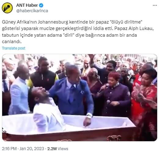 ANT Haber (@habercikarinca): “Güney Afrika’nın Johannesburg kentinde bir papaz “ölüyü diriltme” gösterisi yaparak mucize gerçekleştirdiğini iddia etti. Papaz Alph Lukau, tabutun içinde yatan adama “diril” diye bağırınca adam bir anda canlandı.”
