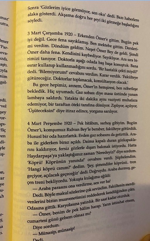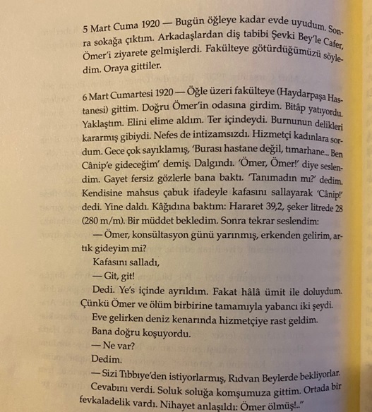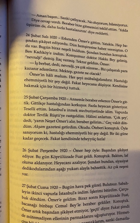 Ömer Seyfettin’in yakın arkadaşı Ali Canip’in günlüğünde 23 Şubat-6 Mart 1920 tarihlerinde artan hastalığı ve hastalık süreci günbegün aktarılır.