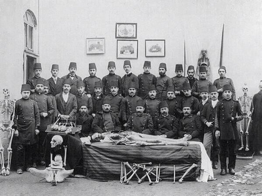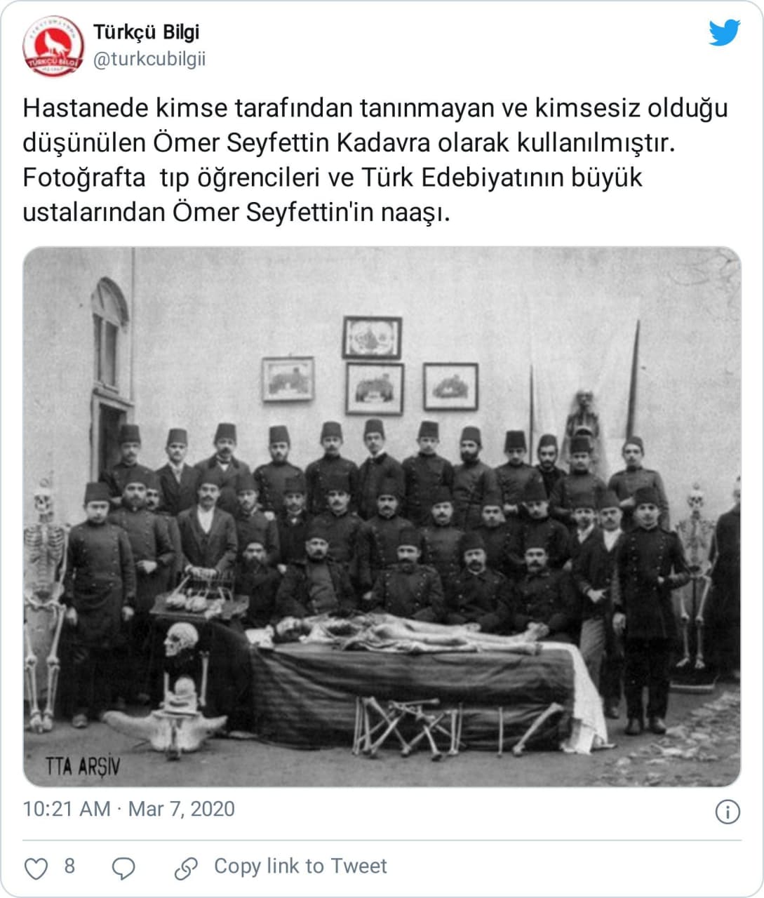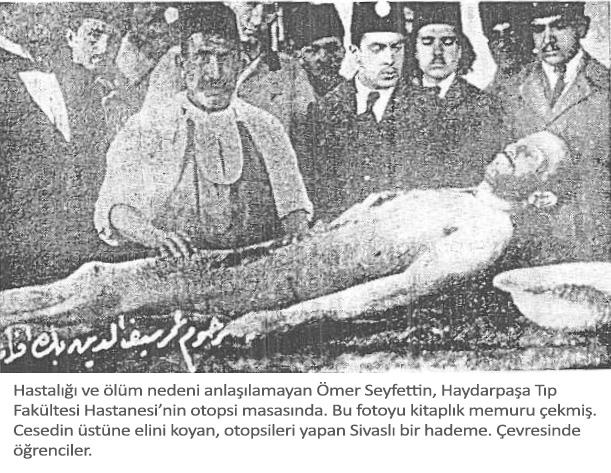 Fotoğrafın izi sürüldüğünde, Ömer Seyfettin’in kadavrası üzerinde yapılan otopsi incelemesine değil, 1890’lı yıllardan Mekteb-i Tıbbiye’de (Tıphane-i Amire’de) bir anatomi dersine ait olduğu anlaşılıyor (Gettyimages‘ta fotoğraf için “Skeletons, organs, and a dissemboweled cadaver surround Turkish medical students and faculty. Istanbul, 1890s. | Location: Faculte Imperiale de Medicine Civile, Istanbul, Turkey. (Photo by Abdullah Freres/Library of Congress/Corbis/VCG via Getty Images)” notu sunulmuş).