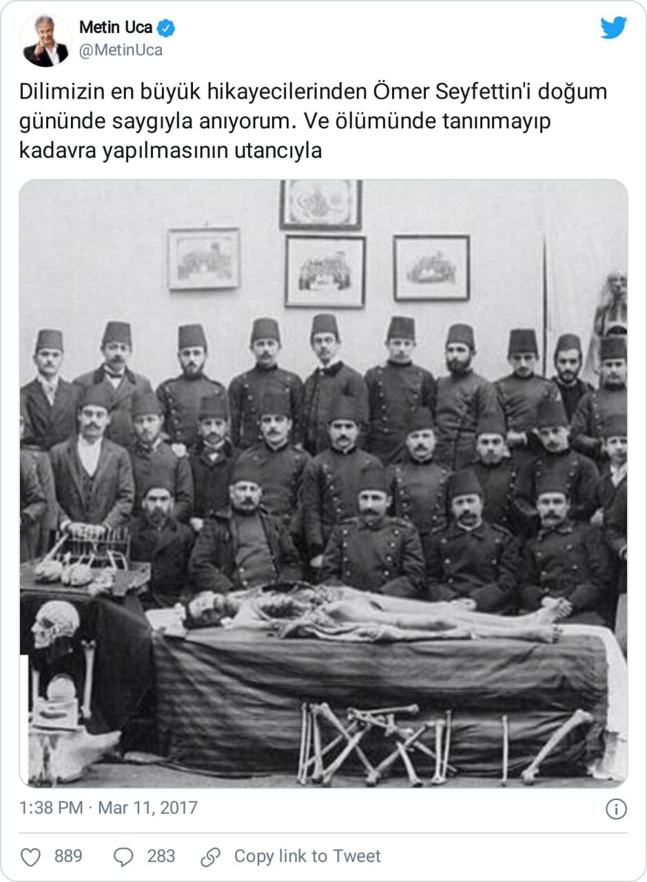 Ömer Seyfettin’e ait otopsi törenine ait olduğu iddiasıyla alakasız bir fotoğrafı kullanan paylaşımlardan örnek sunacak olursak: