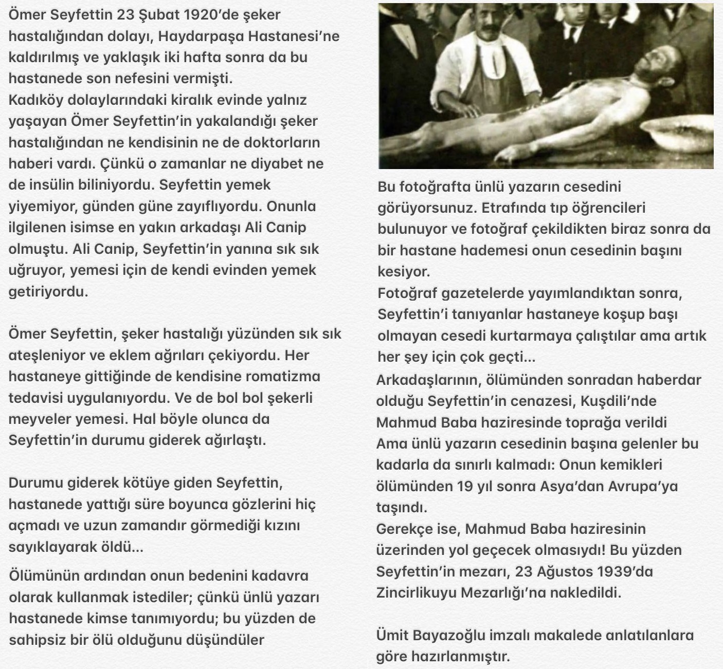 Bir ikincisini yetiştiremediğimiz Ömer Seyfettin sahipsiz ve yapayalnız ölmüş, cenazesi hastanede kesilip biçilmiş ve arkadaşları bundan çok sonra haberdar olabilmişlerdi. İnanmayan Yusuf Ziya Ortaç’ın Bir Varmış Bir Yokmuş: Portreler adlı kitabındaki ilgili bölüme baksın.